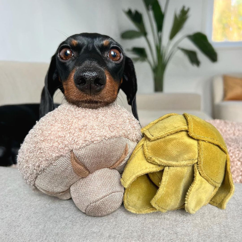 Lambwolf's GUU is a mushroom with small pockets for hiding rewards. The round, unstable bottom makes it extra challenging to find the reward. There is also a beeping sound hidden in the bottom.